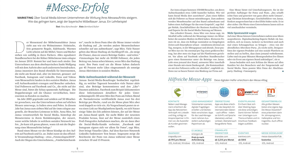 Über Social Media können Unternehmen die Wirkung ihres Messeauftritts steigern. Wie das gelingen kann, zeigt der bayrische Möbelbauer Janua. Ein Lehrbeispiel. (Text: Nina Bärschneider)